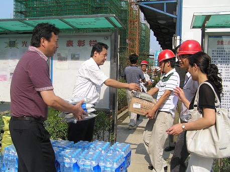 7月26日下昼,,,,,,365英国上市工会副主席李鹏飞一行在省三建副总司理骆新农的陪同下,,,,,,来到该公司高速·滨湖时代广场二期项目部和亚华名苑二期项目部“送清凉”。。。。。将绿豆、白糖、矿泉水等防暑降温食物送到工地,,,,,,受到了职工接待。。。。。
