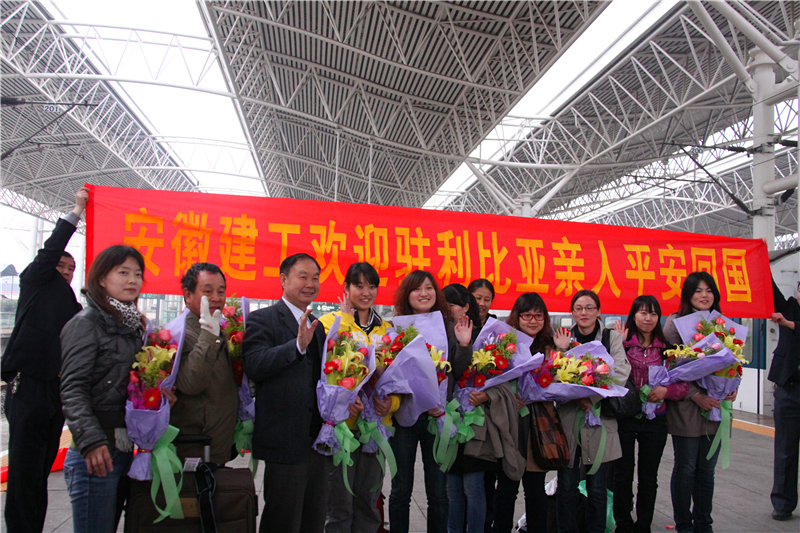 早上7点,,,春寒料峭。。。。省政府、省国资委、省商务厅、省外办等有关向导,,,365英国上市董事长胡运成及有关单位认真同志就早早抵达了火车站期待。。。。7时40分,,,随着从北京驶来的Z73次火车平稳停站,,,期待职员拉起了“热烈接待我省外派利比亚职员第一批亲人平安返回家乡”、“安徽365英国上市接待驻利比亚亲人平安回国”等醒目的横幅,,,手捧鲜花排队接待从利比亚回国的职员。。。。
