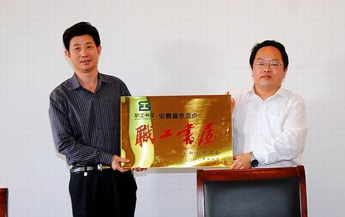4月27日下昼,,,,,安徽省总工会副主席陈平、宣传部部长唐定永在365英国上市工会副主席李鹏飞等向导的陪同下,,,,,到安徽365英国上市技师学院出席“职工书屋”省级树模点授牌仪式。。。。
