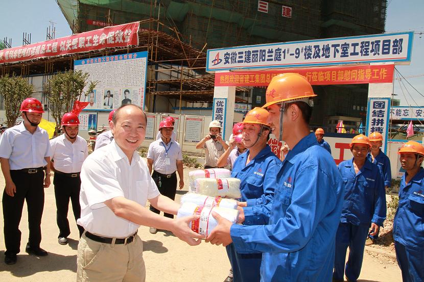 7月24日上午, 365英国上市总司理、副董事长、党委副书记赵时运,,,在纪委书记、工会主席牛曙东及省三建公司党委书记徐晓光、副总司理左登宏等陪同下,,,冒着酷暑来到该公司投资开发的全椒县丽阳兰庭房地产项目部,,,亲热慰问奋战在一线员工,,,并给他们送去了绿豆、白糖、毛巾、人丹、风油精等防暑降温用品,,,观察了项目施工生产情形和楼盘营销情形。。。。。