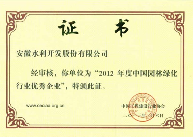 2013年2月,,,,,安徽水利获得由中国工程建设行业协会授予的“2012年度中国园林绿化行业优异企业”及“中国园林绿化AAA级信用企业”的声誉称呼。。该声誉的取得,,,,,牢靠了安徽水利在园林绿化行业方面的资信能力,,,,,提高了市场竞争力,,,,,使品牌建设获得了进一步的提升。。