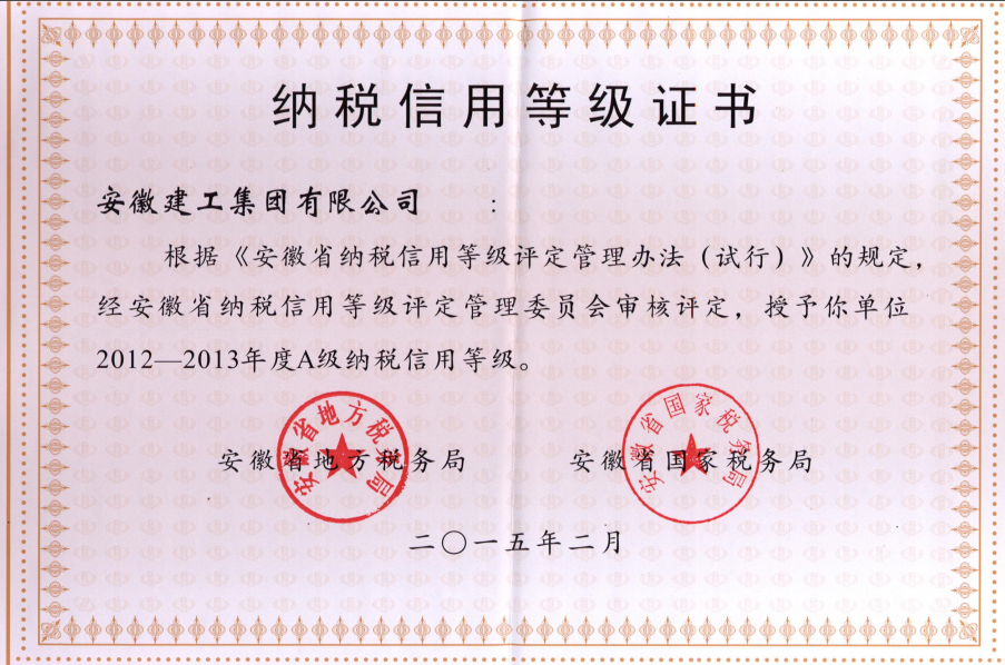 克日,,,,在省国税局、地税局联合举行的2012-2013年度纳税信用品级评定中,,,,365英国上市有限公司被评定为“A级纳税信用单位”,,,,该效果是对安徽365英国上市多年来优异纳税信用状态的综合反映。。。。。