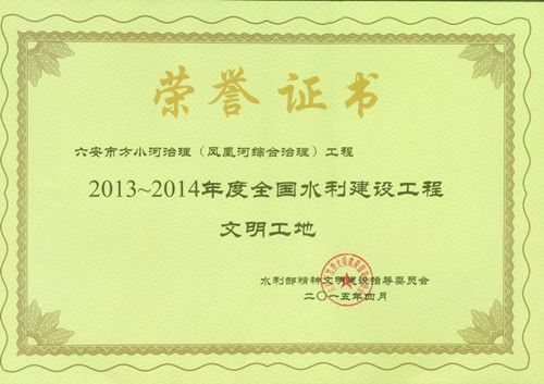 近期,,,水利部精神文明建设指导委员会转达了“天下水利建设工程文明工地”评选效果,,,安徽水利一公司承建的六安市方小河治理(凤凰河综合治理)工程(以下简称凤凰河工程)被评定为“2013-2014年度天下水利建设工程文明工地”。。。