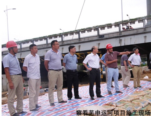 赵总一行首先审查了澛港闸(桥)项目、芜申运河项目施工现。。。。。,,仔细询问了防汛步伐及项目希望情形。。。。。在澛港闸(桥)项目部聚会室,,,划分听取了项目部、水利分公司、安徽水利股份关于项目治理情形汇报。。。。。