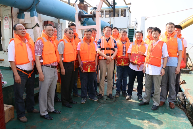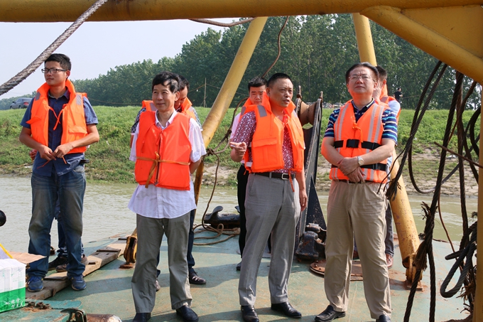 在交通艇上,,,刘总认真听取了安徽交航青弋江疏浚项目的详细先容,,,相识了施工进度和下一步施工妄想。。。。。。登船后与海员们逐一握手、亲热攀谈,,,询问他们生涯饮食情形、防暑降温步伐,,,随后登上船舶操作室,,,详细相识挖泥船施工手艺,,,通过GPS定位视察位于水下的施事情业面积。。。。。。刘总嘱咐海员们在船上作业要注重清静,,,在酷暑天气包管生产进度的同时切实做好防暑降温事情,,,确保康健防暑、平安防暑。。。。。。