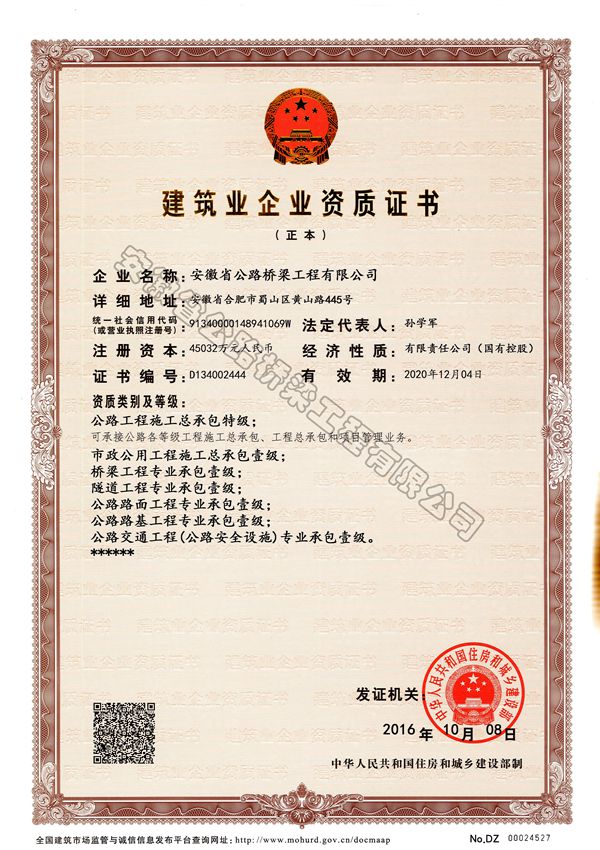 克日,,,,,住房和城乡建设部宣布通告,,,,,安徽路桥公司特级资质顺遂获批,,,,,成为安徽省内首家也是唯逐一家同时拥有公路工程施工总承包特级资质和公路行业工程设计甲级资质的企业。 。。。。