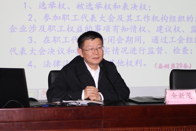 余部长以《怎样当职工代表》为题,,解说了职工代表应推行的权力和义务,,以图文并茂的形式,,通过数据和事例,,重点叙述了职工代表要有强烈的代表意识,,要有一定的知识水平,,要有较强的事情能力,,并对职工代表撰写提案作了详细指导。。。 。 。。