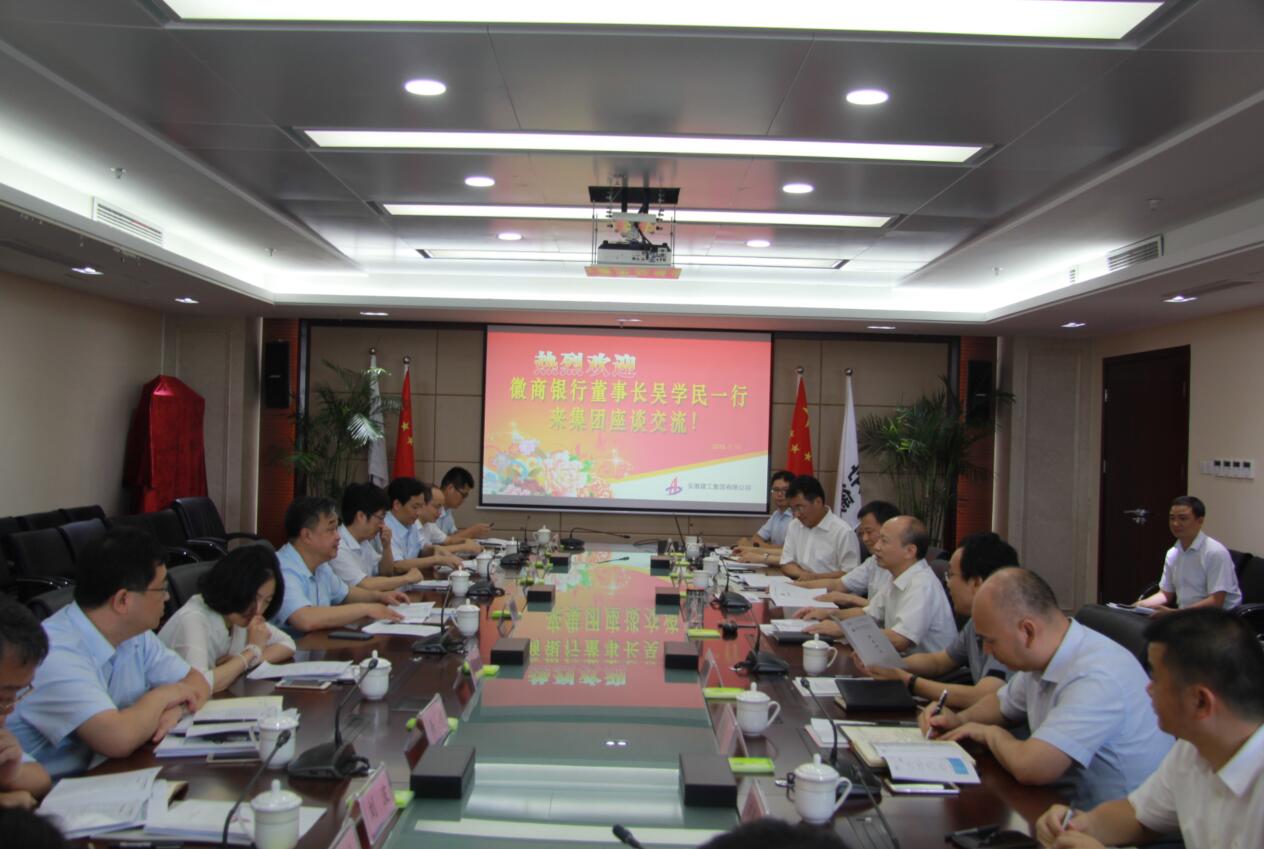 711日下昼,,,,,,徽商银行党委书记、董事长吴学民率队来我集团调研交流。。集团公司党委书记、董事长赵时运亲热会见了吴学民董事长一行。。双方在安开国际大厦29楼聚会室举行了座谈会,,,,,,就项目融资相助相关事宜举行交流钻研。。