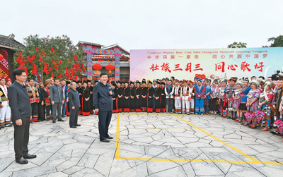 广西是我国少数民族生齿最多的自治区。。27日上午,,习近平来到位于南宁市邕江之畔的广西民族博物馆,,旅行壮族文化展。。博物馆外,,三月三“歌圩节”壮族对歌等民族文化活动正在这里集中展示。。习近平强调,,广西是天下民族团结前进树模区,,要继续施展好树模刊行动用。。各民族配合团结前进、配合昌盛生长是中华民族的生命所在、实力所在、希望所在,,在周全建设社会主义现代化国家的新征程上,,一个民族都不可少,,各族人民要心手相牵、团结奋进,,共创中华民族的优美未来,,共享民族再起的伟大荣光。。