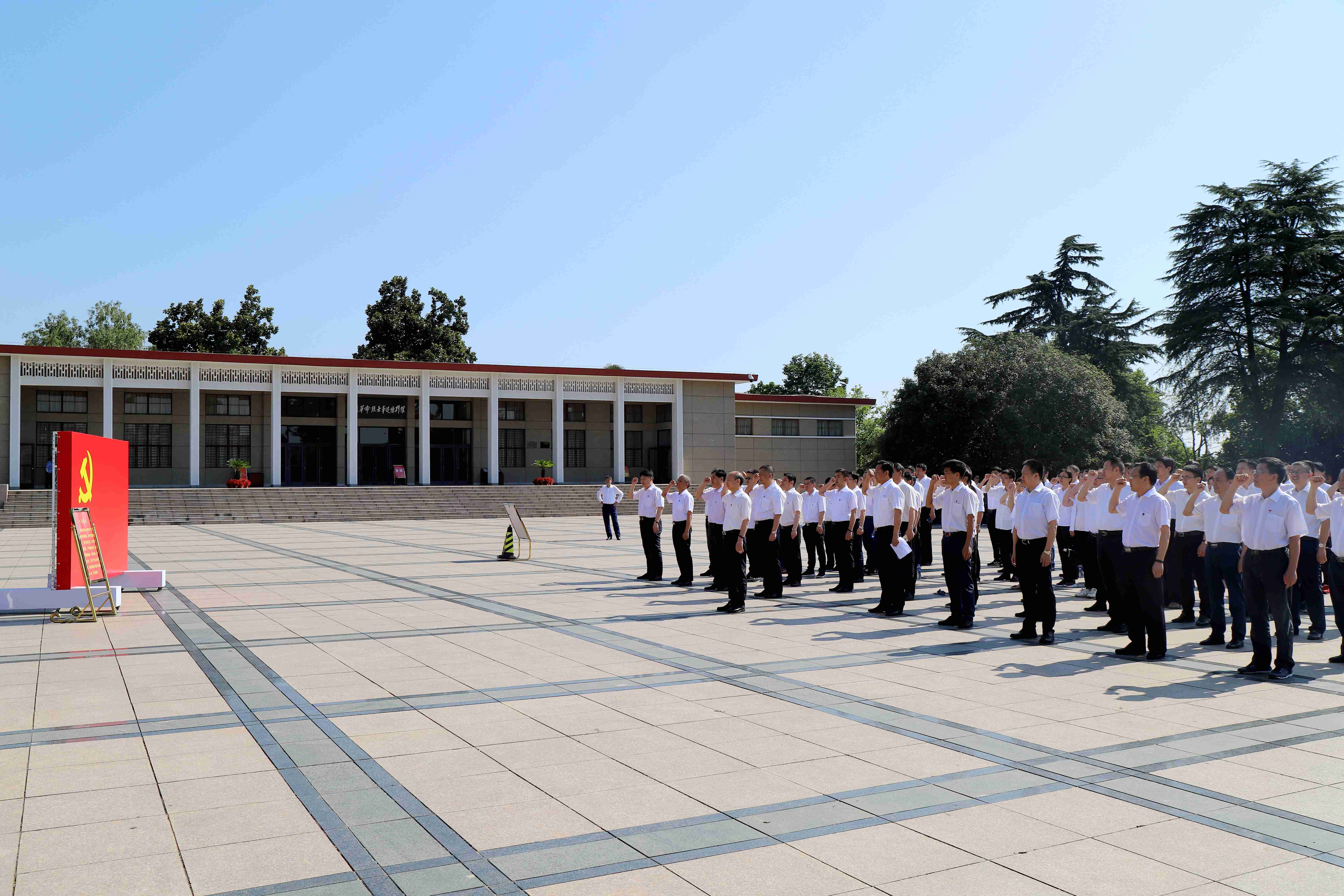 赵时运一行怀着敬重的心情从陵园广场拾阶而上,,,,步行到义士纪念碑前方肃立,,,,向纪念碑敬献花篮,,,,赵时运书记悉心整理花篮绶带。。。。全体党员深深三鞠躬,,,,表达了对革命义士的深切思念和无限敬仰。。。。面临党旗,,,,赵时运书记向导全体党员在党旗眼前举行庄重宣誓,,,,重温入党誓词,,,,铿锵有力的誓词,,,,激昂回响,,,,表达了365英国上市控股党委矢志不渝坚守初心、高昂有为担使命的坚定信心。。。。