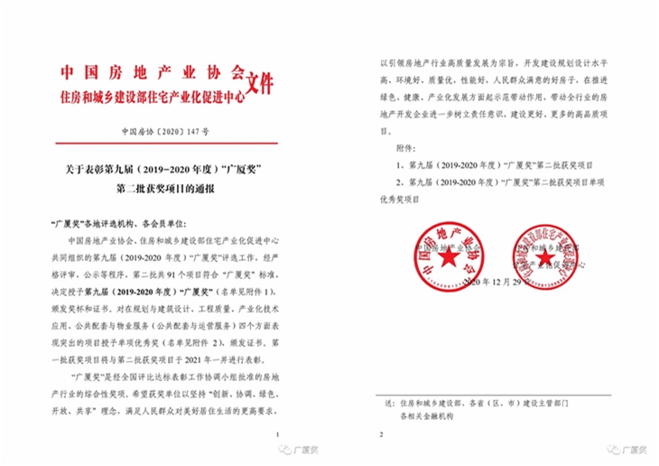 “广厦奖”是经住房和城乡建设部批准,,,,由中国房地工业协会、住房和城乡建设部住宅工业化增进中心配合设立的我国房地产开发项目的综合性大奖。。 。。是由住宅与城乡建设部揭晓,,,,经国务院批准设立的国家级房地产奖、行业内最权威的房地产奖项评选,,,,相当于鲁班奖、梁思成奖、詹天佑奖,,,,代表房地产综合开刊行业的最高声誉。。 。。