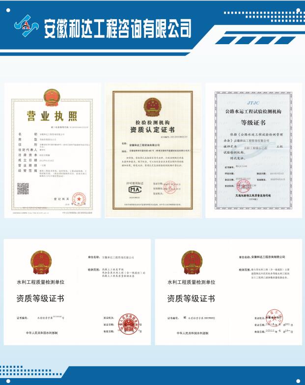 和达咨询的前身是安徽水利中心实验室,,,2012年因交通项目市场谋划及质量羁系需要,,,注册建设安徽江河试验检测有限公司,,,2018年更名为安徽和达工程咨询有限公司。。。经由多年生长,,,现拥有“交通部公路工程试验检测综合乙级”“水利部水利混凝土专项甲级”及“岩土专项乙级”检测资质,,,取得安徽省质量手艺监视局计量认证(CMA)证书,,,具有“建设厅建设工程造价咨询乙级”资质。。。检测用房面积1800平方米,,,设有收样室、留样室、人防检测室、人防检测平台等20余个专业功效室和400余台套检测装备,,,基本知足日常试验检测需要。。。实现营业收入、利润、上缴资金逐年大幅增添,,,2019年月表蚌埠市乐成申报建设国家级磨练检测集聚区(安徽),,,被蚌埠市列为重点生长检测机构。。。