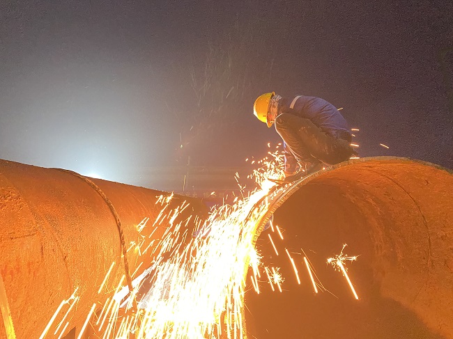 为了包管后期主塔和上横梁施工的顺遂往前推进,,,,在管桩加工装置之前,,,,项目部对现场的施工手艺职员举行了详细的手艺交流和交底。。项目部全体员工发挥一连作战精神,,,,全力奋战在施工一线,,,,鼓足劲头,,,,抢抓工期。。施工现场,,,,白天机械轰鸣,,,,夜晚挑灯夜战,,,,参建职员放弃休息,,,,不畏艰难,,,,争分夺秒,,,,以流水作业的方式举行钢管桩的毗连、拼装和毗连系的加工、装置等事情。。同时,,,,项目部备足了物资、机具、质料以及富足的防暑食物及药物,,,,安排专人认真协调,,,,包管职工的身体康健,,,,为现场施工保驾护航。。