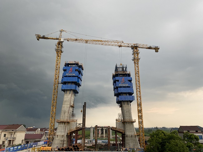 G347PPP杨湾河特大桥主墩两岸主塔划分进入到第五节和第六节施工,,,,凭证施工方案要求,,,,主塔第一节到第五节之间共有二道毗连系和一道自动支持施工。。