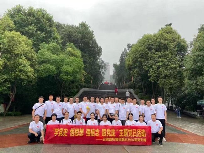 为纪念中国共产党建设100周年,,,周全深入落实好党史学习教育,,,推进支部的组织建设,,,激励全体党员继续和发挥党的优良古板和作风,,,进一步增强下层党组织的凝聚力、招呼力和战斗力,,,安徽路桥集团第五分公司党支部于6月26日抵达有“红军的摇篮、将军的家乡”之称的金寨县,,,以“学党史 悟头脑 强信心 跟党走”为主题,,,瞻仰革命先烈,,,重温入党誓词,,,接受革命古板教育。。五分公司全体党员、起劲分子等40余人加入此次活动。。