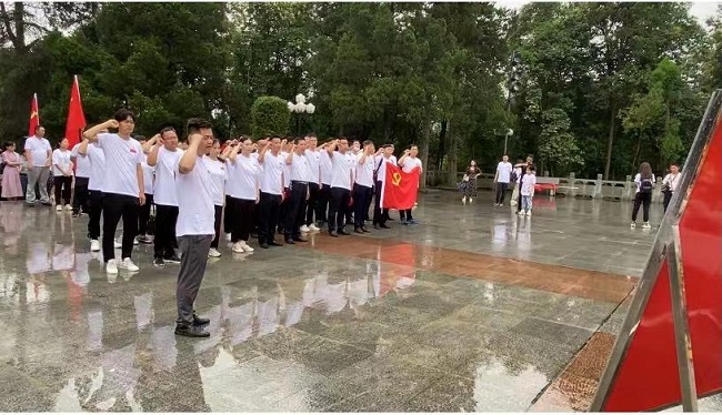 旅行展览竣事后,,,全体同志沿循环步道祭祀旅行了红军义士墓园。。园内埋葬革命义士和已故老红军近200位,,,同志们身临其田地感受到金寨红军义士忠贞不平、甘于奉献的高尚品质和革命精神。。在洪学智将军纪念碑前,,,同志们分批举行了默哀与致敬鞠躬。。青松翠柏旁,,,庄重肃穆地回首了两膺上将的共和国向导人的绚烂一生,,,感伤良多。。两名党员代表向革命义士敬献花篮,,,分公司副书记、总司理代杰上前整理缎带。。随后,,,全体同志面向义士纪念碑三鞠躬,,,并庄重宣誓,,,重温入党誓词,,,坚定入党初心。。