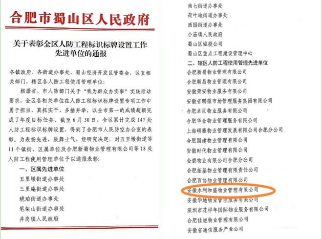 克日,,,集团物业安徽水利和盛物业获合肥市蜀山区人民政府转达表扬,,,荣获合肥市蜀山区人防工程使用治理先进单位称呼。。。。。