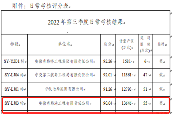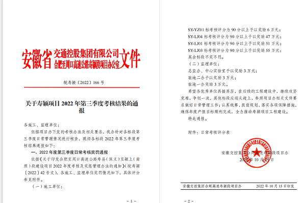 寿颍高速03标项目在疫情特殊时期,,,牢牢掌握“疫情要防住、生产要稳住、清静要把住”的清静生产理念,,,在做好防疫事情的同时,,,通过自我加压,,,细密安排产值目的、施工妄想、施工组织等重点事情,,,起劲调动宽大职工的责任感、紧迫感,,,有用施展了劳动竞赛“学、比、拼、超”起劲作用,,,在安徽交控集团合周高速寿颍段项目办开展的2022年第三季度审核效果中,,,得分优异,,,获得了业主给予的55万元的奖励。。。。