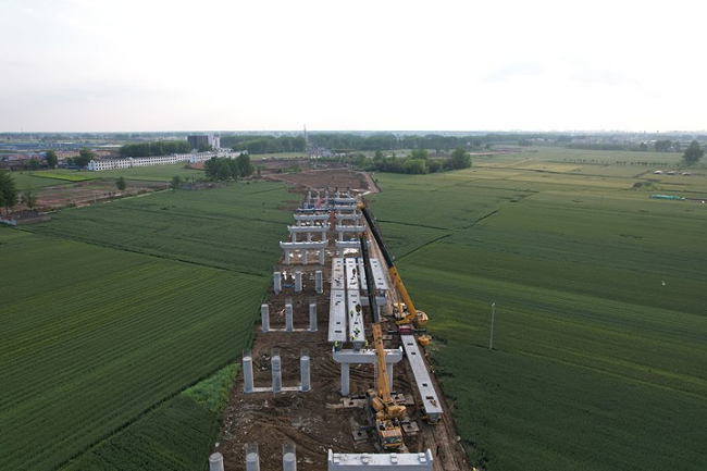 合肥至周口高速公路颍上至临泉段,,位于安徽省阜阳市阜南县中岗镇。。。。本标段包括主线桥梁4.96km/16座,,其中含陶孜河特大桥一座,,长2644米。。。。预制梁共计2204片,,其中箱梁805片,,T梁342片,,π梁656片,,盖梁162片,,桥面板239片。。。。本次首榀箱梁的架设位于K22+216.5 S252疏散立交桥20跨右幅左边梁,,接纳汽车吊举行架设。。。。