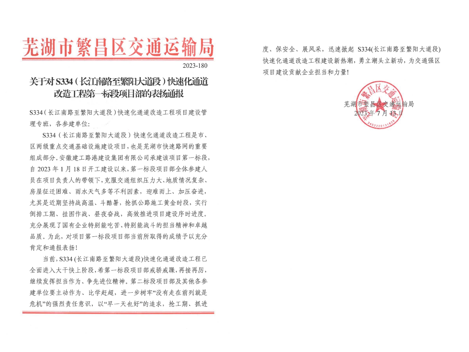 7月13日, ,,,,,芜湖市繁昌区交通运输局发来表扬信, ,,,,,对365英国上市路港S334快速化通道刷新工程第一标段项目部目今所取得的效果予以充分肯定和转达表扬 。。。