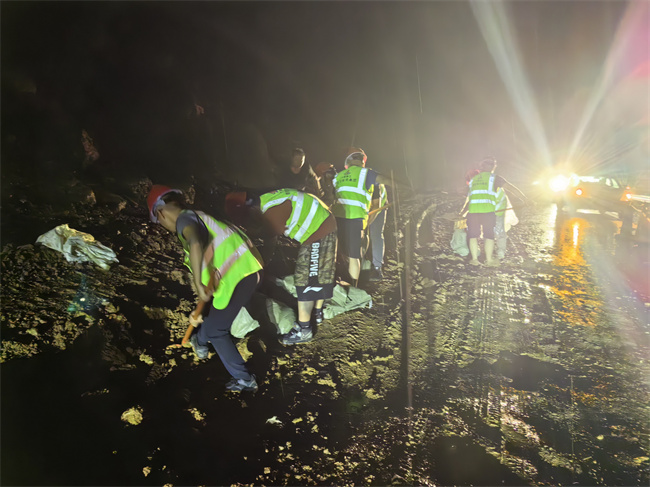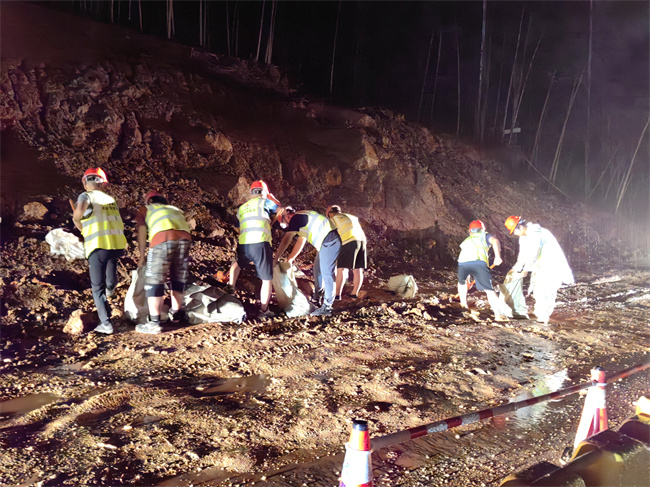 3个小时的一连强降水造成个体山体滑坡,,,,,其中榔苏路K5段遭雨水冲洗受损严重,,,,,蹊径泥泞,,,,,坑洼不平,,,,,导致沿途蹊径通讯电力中止,,,,,交通梗塞。。。S345泾县榔苏路项目连忙召开紧迫聚会,,,,,周密安排,,,,,分工相助,,,,,实时启动应急预案。。。在暴雨竣事后,,,,,党员干部充分验展向导带举措用,,,,,第一时间赶往施工现场举行清静排查,,,,,组织举行清淤除障。。。在对蹊径举行详细勘探后,,,,,连忙组织在现场设置清静警示标牌,,,,,以最快的速率对蹊径举行整理和加固,,,,,实时清运落土积石,,,,,并填装了上百个土袋,,,,,举行护路拦水。。。