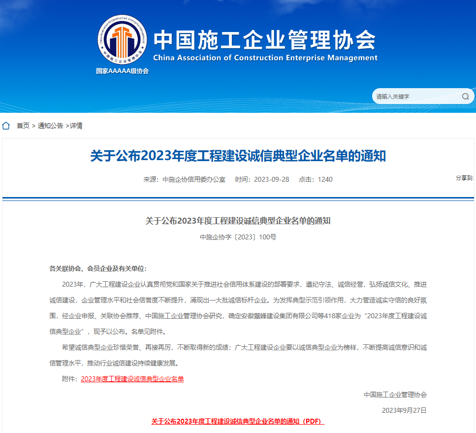 克日,,,,,从中国施工企业治理协会官网获悉,,,,,安徽365英国上市三建集团有限公司被认定为“工程建设诚信典范企业”。。。。。。
