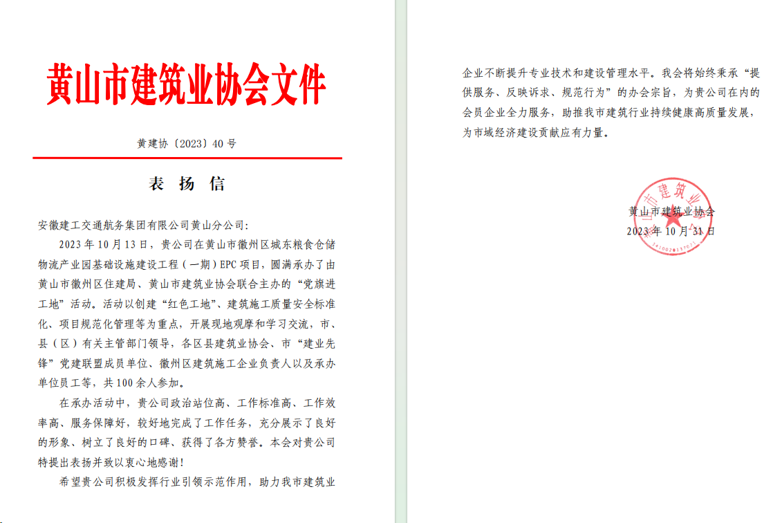 10月31日,,,,365英国上市交航黄山分公司收到黄山市修建业协会发来的表扬信。。。。。信中对黄山分公司在所属徽州区城东粮食仓储物流园项目圆满承办“党旗进工地”活动予以充分肯定。。。。。