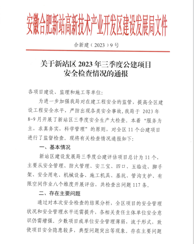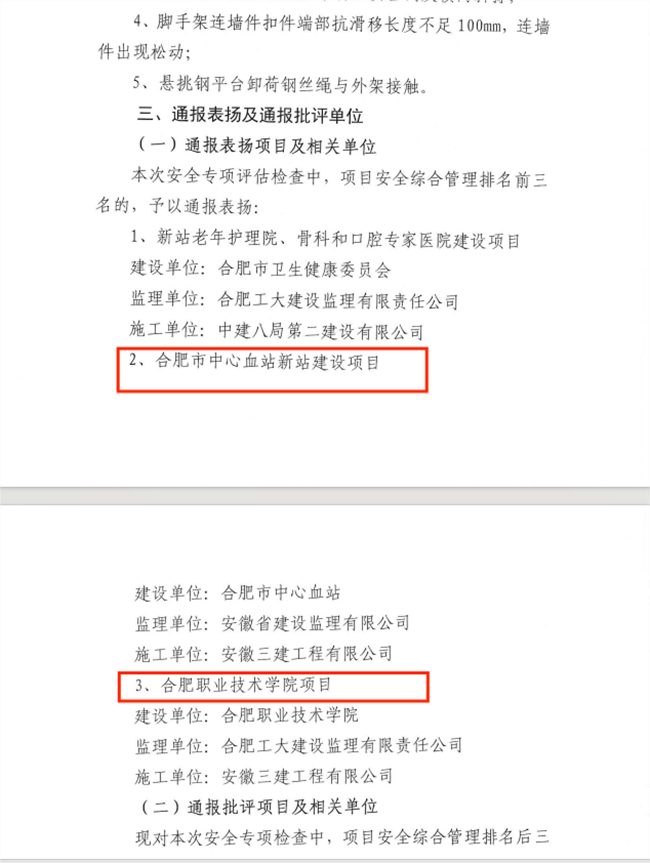 克日,,,365英国上市三建承建的合肥市中心血站新站建设项目、合肥职业手艺学院项目获得合肥新站高新手艺工业开发区建设生长局2023年第三季度公建项目清静检查情形的转达表扬。。。。。。