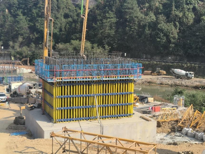 本项目位于山区狭窄地形下,,,桥梁高墩施工保存高空施事情业条件差、人工操作难题、施工清静包管差等倒运因素。。。为包管施工进度、改善施工质量和清静,,,项目部通过连系翻模和滑模施工工艺的各项优点,,,运用SJ-PJ200悬臂系统模板施工工艺,,,包管了滑模施工高墩的速率,,,改善了墩柱混凝土外观质量,,,最大限度地降低了施工本钱,,,减小现场事情职员的事情量,,,降低施工中职员的清静风险,,,对加速山区公路建设、提高建设清静性和工程施工质量和工期控制起到了要害作用。。。