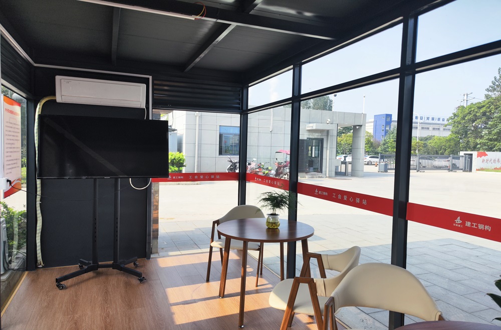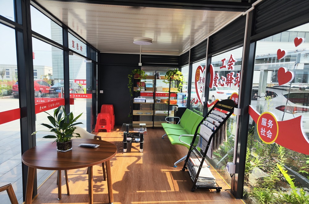 据悉,,,芜湖钢构工会驿站修建面积40平方米左右,,,配备AED(自动体外除颤仪)、血压计、体温计、电视、空调、饮水机、书架报刊、自动销售机等装备,,,不但能够知足户外劳动者饮水、就餐、休息、如厕等基本需求,,,还具备充电、储物、阅读、上网、收听收看、应抢救援等拓展功效,,,是周围环卫工人、快递小哥等社会服务群体的“温馨港湾”。。