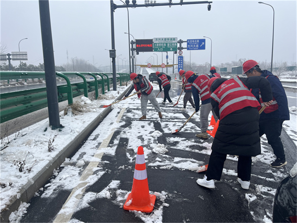 G312合六路(南岗镇-侯店路)项目部迅速响应,,组织工程部、清静部、物资部等10名职员,,携带铁锹等除雪工具,,赶赴方兴大道快速路新桥机场入口处,,睁开了一场主要而有序的除雪保畅事情。。。。。。