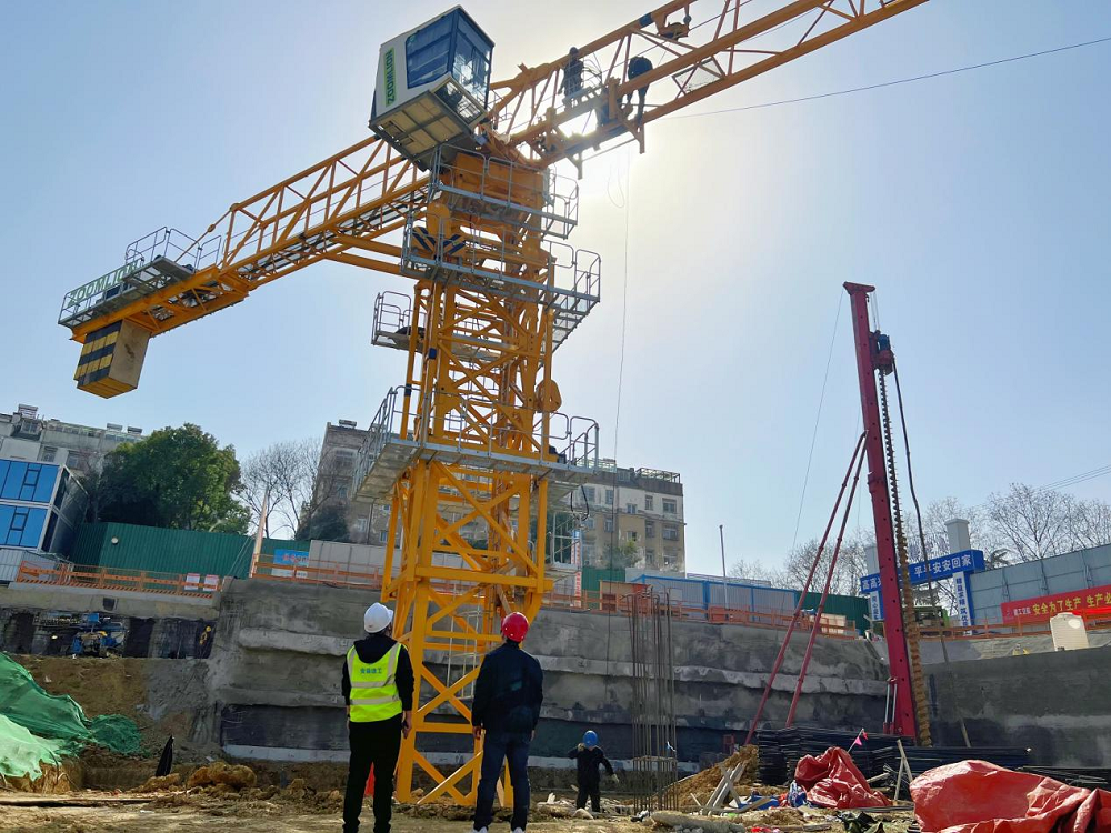 首台塔吊装备的投入使用,,,,,提高了项目质料运输效率,,,,,为接下来地下室、地面主体楼层钢筋、模板、方木等施工物料运送提供了极大便当,,,,,对加速项目施工建设起到优异的推进作用。。。