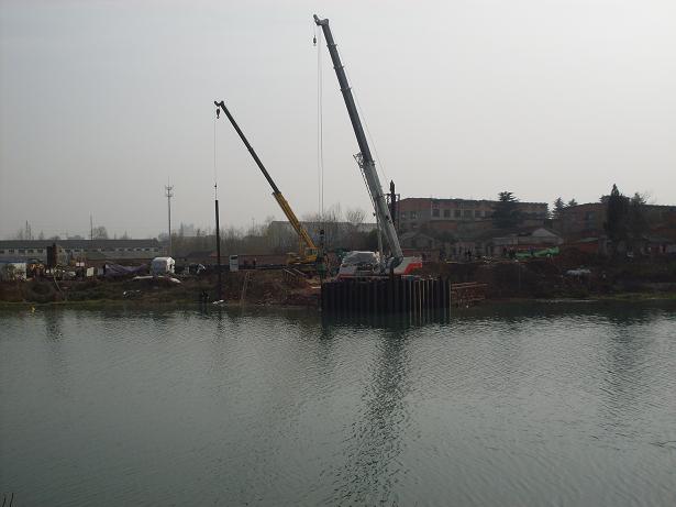 淠望路大桥作为市政工程具有工期紧、使命重、手艺难度大的特点,,,但经项目部向导全心组织、科学安排,,,加大人力与装备的投入,,,自2月1日进场开工以来,,,所有90根挖孔桩已开挖41根,,,累计深度270m ;;;于2月18日最先举行要害工序——主墩右幅钢板桩围堰施工。。由于淠史杭干渠肩负皖豫两省14个县(区)的春耕浇灌使命,,,六安市重点办要求加速施工进度,,,必需在4月15日完成所有水下工程及用于水面以上施工的支持等,,,并于4月25日前完成围堰拆除整理事情。。项目部连忙召开紧迫发动会,,,招呼全体手艺职员战胜一切难题和挑战,,,坚决完成上级交接的使命,,,并连忙组织手艺职员凭证钢板桩长度、水深、地质、承台埋置深度等情形,,,制订了科学的施工手艺方案、建设了以项目部司理、副司理为组长的清静向导小组。。施工所用的T90振动锤、70t吊车、25t吊车、PC200挖机、 T100推土机、ZLM50装载机、自卸车等重型机械装备陆续开进施工现场。。