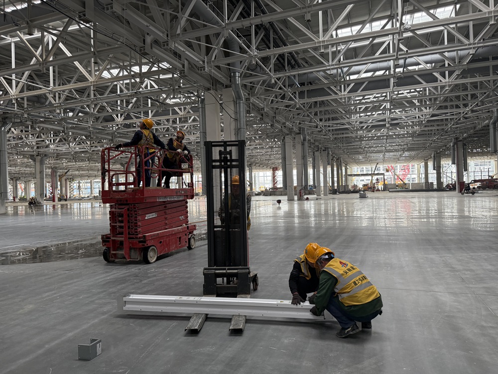 阻止现在,,焊装车间灯具、车间一东侧630毫米循环水不锈钢管已所有装置完成。。。本周完成消防箱装置150套,,母线装置700米,,屋迎风机装备吊装到位,,准期完成节点目的。。。与此同时,,工艺厂家已进场同步施工。。。