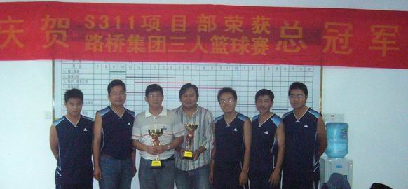 9月16日,,,,,,省路桥集团副总朱晓奎、蚌淮项目司理卢红松冒雨来到S311滁定路03标祝贺项目部荣获该公司三人篮球赛总冠军。。。。。