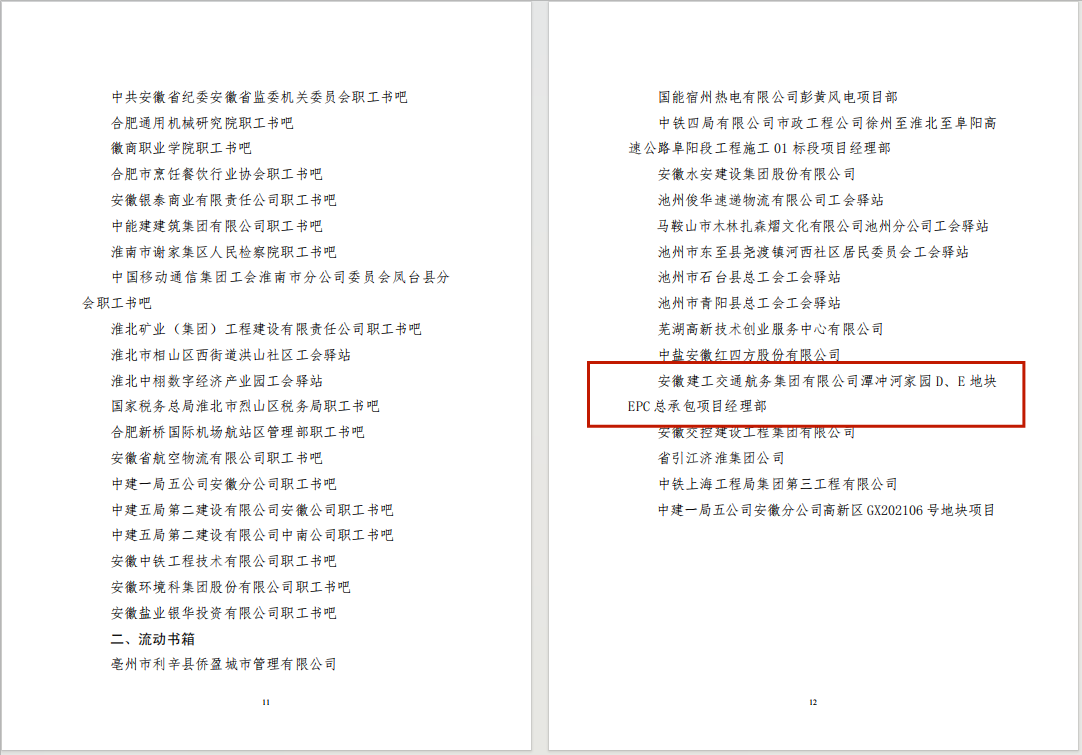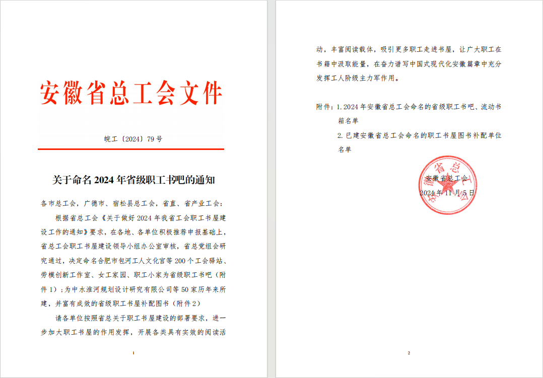 克日,,安徽省总工会宣布《关于命名2024年省级职工书吧的通知》,,公司潭冲河家园项目榜上著名,,获评2024年安徽省总工会“流动书箱”声誉称呼 。。。。。