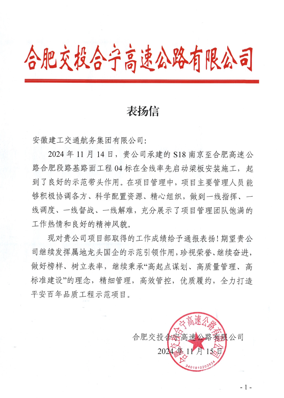 11月15日,,S18南京至合肥高速公路合肥段路基路面工程04标项目收到来自业主单位-合肥交投合宁高速公路有限公司表扬信。。。