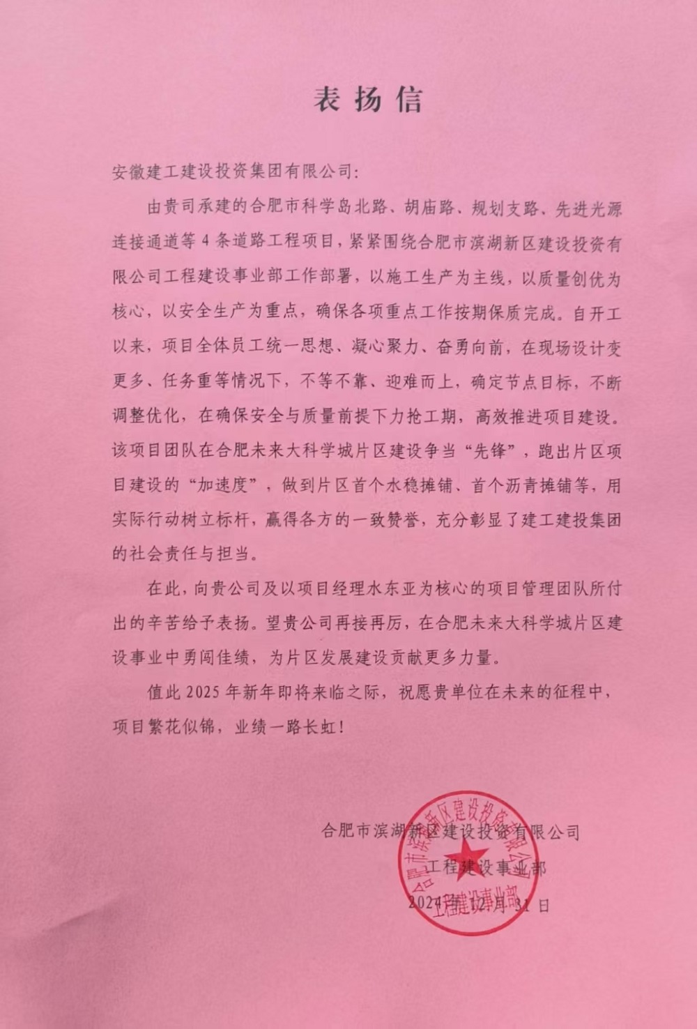 近期,,,,,,365英国上市建投集团喜讯频传,,,,,,合肥市科学岛北路、胡庙路、妄想支路、先进光源毗连通道等4条蹊径工程项目与长丰下塘镇都会更新余岗路等8条蹊径建设工程项目2标段先后收到业主单位合肥市滨湖新区建设投资有限公司和长丰县重点工程治理建设中心的表扬信。。。。。