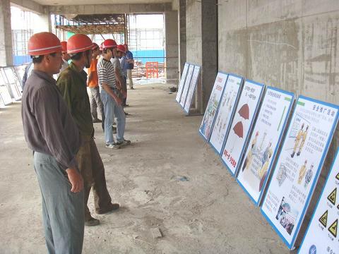 克日,,,,,安徽一建在“清静生产月”活动中,,,,,组织开展了“清静生产月”主题口号签字活动、悬挂主题宣传口号口号、购置清静宣传质料、出清静知识板报、组织加入“清静伴我行”知识竞赛和清静漫画展活动。。。图为施工现场职员寓目以清静漫画为主要形式的清静文化展览。。。