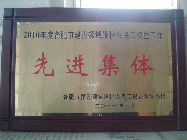 日前,,,安徽省第二修建工程公司从合肥市农民工维权向导小组召开的表扬大会上,,,捧回了“2010年度合肥市建设领域维护农民工权益先进整体”的奖牌。。。。。。这是自2008年以来安徽二建公司第三次获此殊荣。。。。。。