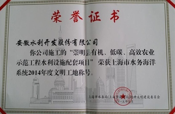 近期,安徽水利上海分公司承建的崇明县有机、低碳、高效农业树模工程水利设施配套项目在施工历程中全心组织,科学治理,,,起劲实验清静标准化和文明施工,一再受业主单位好评,并被上海市水务局精神文明建设委员会授予“上海市水务海洋系统文明工地”声誉称呼。。。。。