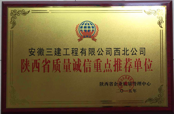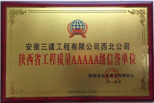 克日,,,,安徽三建西北公司被陕西省企业质量治理中心评为“陕西省工程质量AAAAA级信誉单位”、“陕西省质量诚信重点推荐单位”。。。。。。