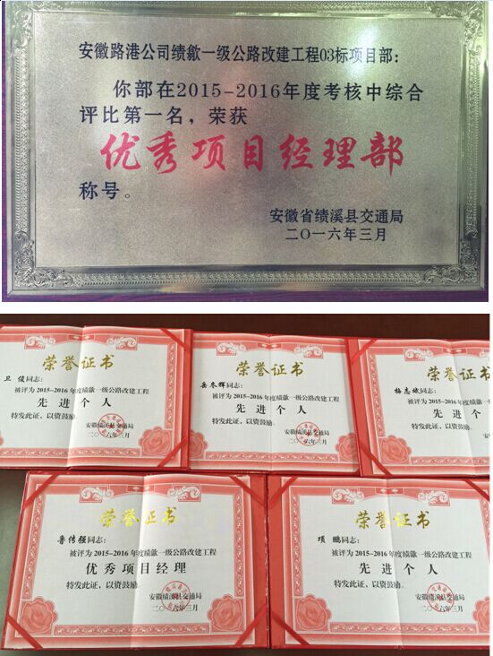克日,,,,,,安徽路港公司承建的S215绩溪至歙县一级路改365英国上市程03标,,,,,,在绩溪县交通局2015年度在365英国上市程综合考评中,,,,,,排名第一。。荣获“优异项目司理部”、“优异项目司理”、“先进个人”等声誉称呼。。