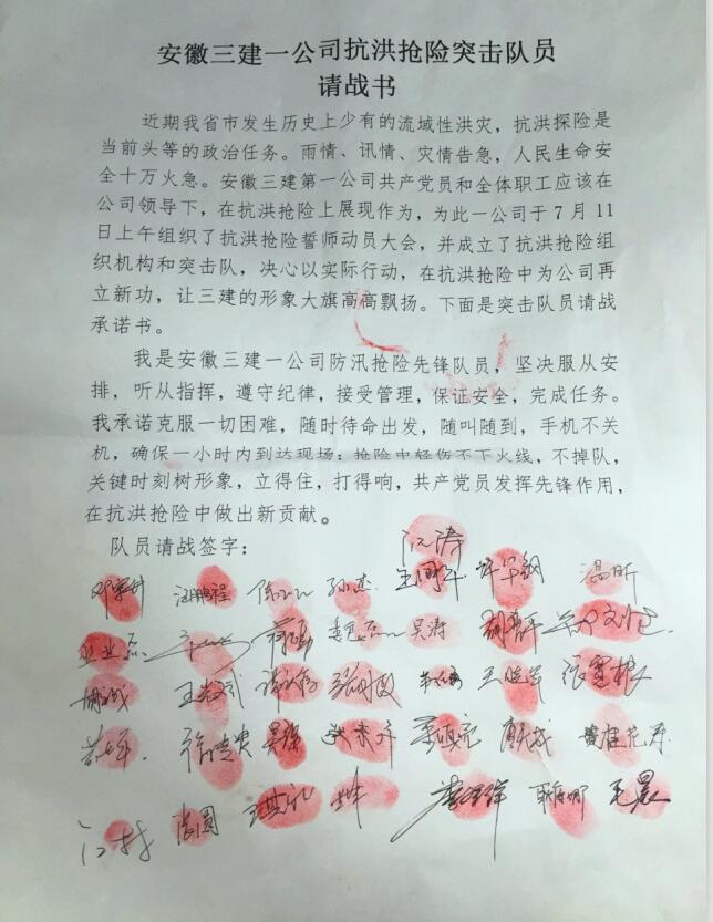在这封“请战书”上,,,,,安徽三建一分公司所辖合肥项目部全体职工依次郑重署名,,,,,摁下红彤彤的指模,,,,,恰是一道无声的发动令。。。。他们纷纷体现,,,,,急切盼愿能奔赴抗洪救灾第一线,,,,,只要灾区需要,,,,,公司一声令下,,,,,各人时刻整装待发。。。。
